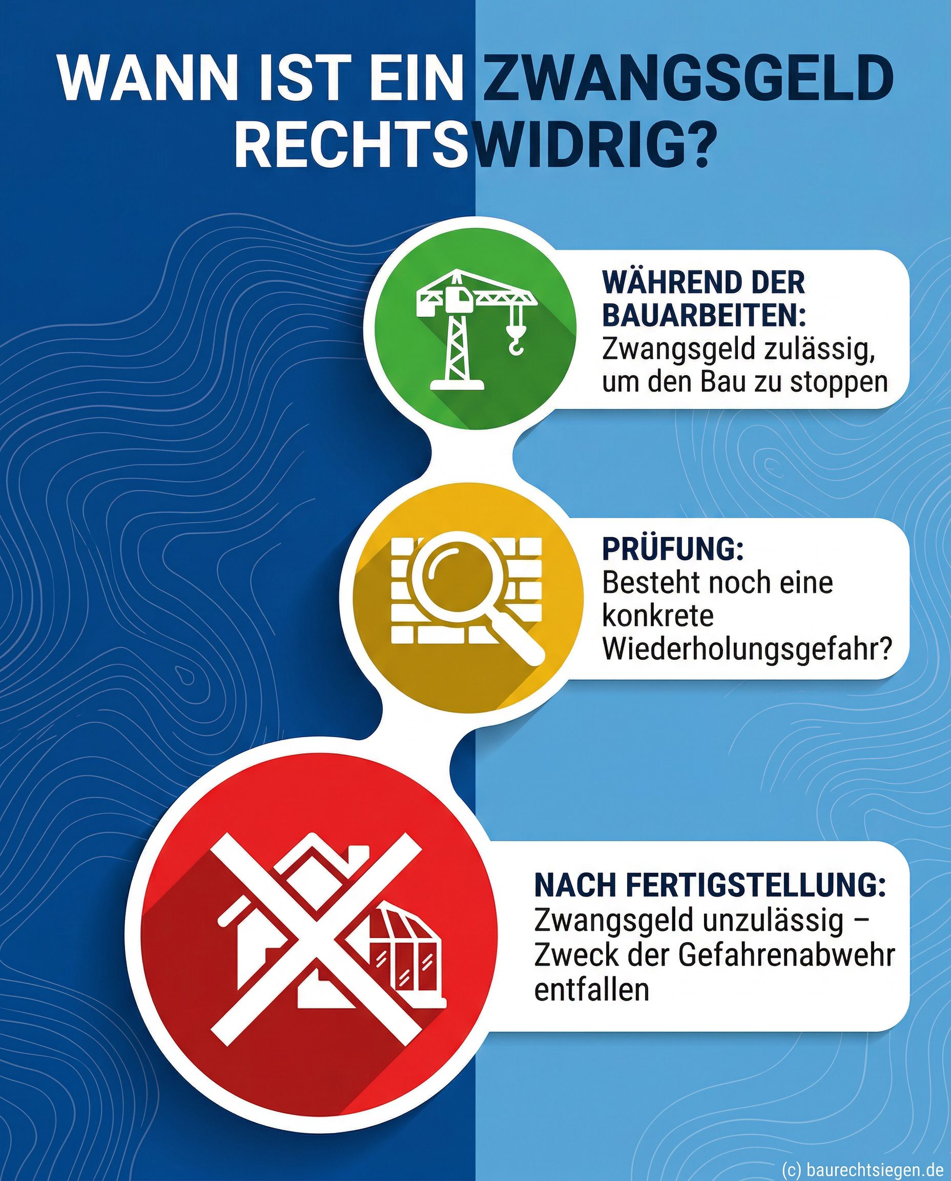 Eine Zwangsgeldfestsetzung erweist sich als rechtswidrig, wenn ein künftiger Verstoß gegen den zugrunde liegenden Verwaltungsakt (die behördliche Anordnung) nicht mehr droht. Diese Regelung greift unabhängig davon, ob sich eine ursprüngliche Baustilllegungsverfügung nach § 43 Abs. 2 VwVfG formell bereits erledigt hat. Erledigt bedeutet in diesem Zusammenhang, dass die Anordnung ihren Zweck verloren hat, weil der Bau bereits abgeschlossen ist. Auch die von Behördenseite oft angeführte „Doppelnatur“ des Zwangsgeldes als Vollstreckungsstufe und eigenständiger Leistungsbescheid rechtfertigt keine Festsetzung ohne einen akut drohenden Verstoß. Die landesgesetzlichen Regelungen in der Niedersächsischen Bauordnung sehen eine nachträgliche Festsetzung ohne Wiederholungsgefahr schlichtweg nicht vor.